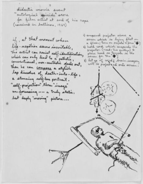 («Дидактическое кинособытие — автологическое самоубийство») со сценой, где режиссеру предписывалось уронить проектор себе на голову, чтобы отобразить «образы мозга» на экране, заблаговременно установленном на полу.